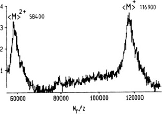 Karas和Hillenkamp在1988年Bordeaux國(guó)際質(zhì)譜會(huì)議上發(fā)布了使用靜態(tài)電場(chǎng)反射式飛行時(shí)間質(zhì)譜儀結(jié)合MALDI電離獲得的β-半乳糖苷酶(分子量116,900)的光譜圖,首次展示了單電荷離子質(zhì)量大于100,000的質(zhì)譜圖,標(biāo)志著MALDI-TOF MS新時(shí)代的來(lái)臨。