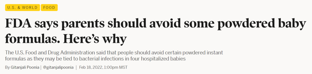 公告顯示,2月18日,美國食品和藥品監(jiān)督管理局(FDA)宣布,正在調(diào)查四名嬰兒感染克羅諾桿菌和沙門氏菌事件的投訴?!八信c這些投訴有關(guān)的四例病例都住院治療了,其中一例可能因克羅諾桿菌導致了死亡。”四名嬰兒均食用了美國某公司在密歇根州斯特吉斯工廠生產(chǎn)的奶粉。