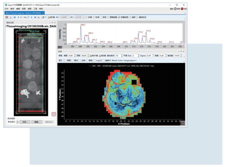 QuanIMAGE,可以對質(zhì)譜得到的實驗數(shù)據(jù)進行分類、優(yōu)化和處理,來進行成像。強大的數(shù)據(jù)分析和圖像處理軟件平臺,可以對成像圖任意區(qū)域進行分析和比對。
