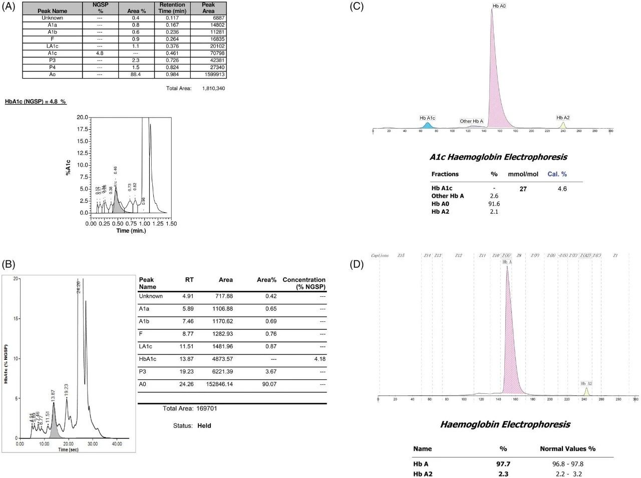 圖.糖化血紅蛋白和血紅蛋白分析。通過Variant II Turbo 2.0(A),HPLC系統(tǒng)(B),和CE系統(tǒng)(HbA1c程序)(C)檢測糖化血紅蛋白。血紅蛋白分析是通過CE系統(tǒng)的Hb程序(D)。