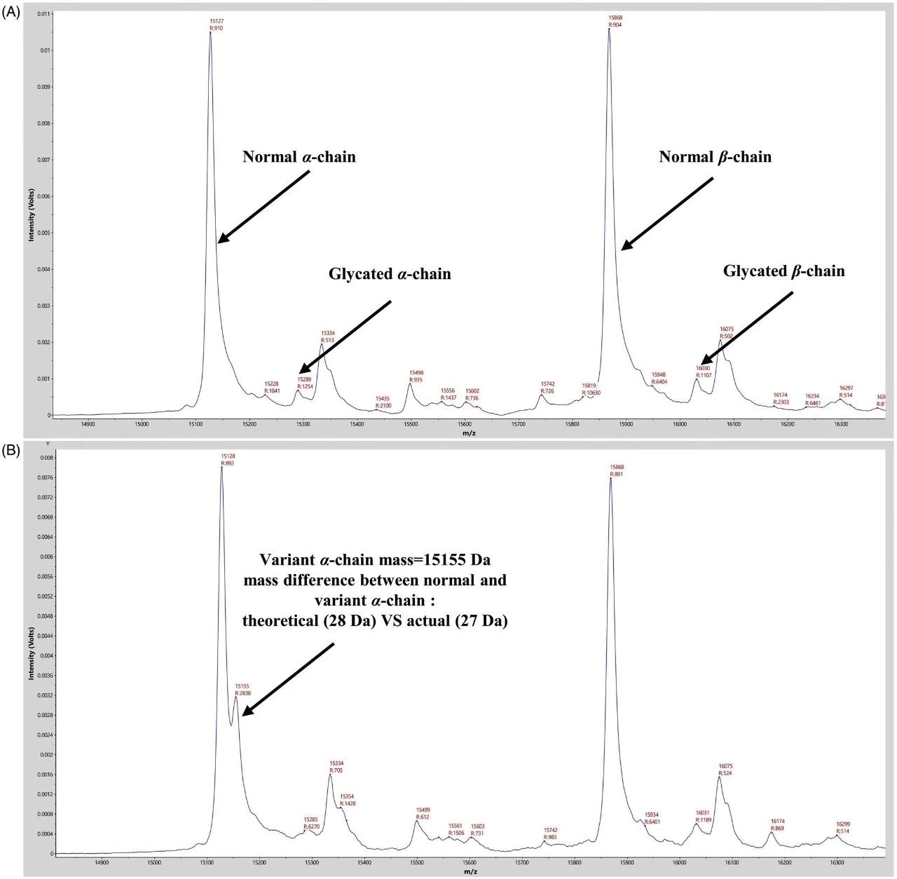圖. MALDI-TOF MS(QuanTOF)血紅蛋白分析。(A)非變異樣品的質(zhì)譜圖顯示α-鏈(15127 Da)、β-鏈(15868 Da)以及相應(yīng)的糖基化α-鏈(15289 Da)和糖基化β-鏈(16030 Da)。(B) Hb-柳州的質(zhì)譜圖顯示一個(gè)變異的α-鏈峰(15155Da)。