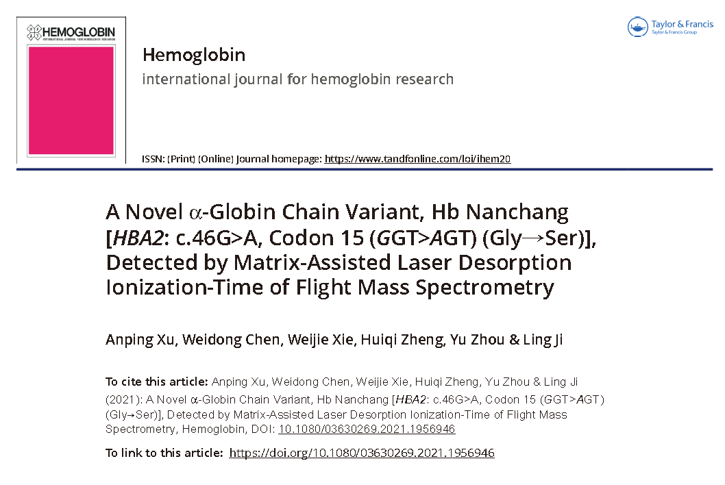 A Novel?α-Globin Chain Variant, Hb Nanchang [HBA2: c.46G>A, Codon 15 (GGT>AGT) (Gly→Ser)], Detected by Matrix-Assisted Laser Desorption Ionization-Time of Flight Mass Spectrometry,https://doi.org/10.1080/03630269.2021.1956946。